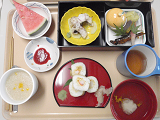 〈南瓜と小豆のようかん、薩摩きんとん、オクラとろろよせ、小芋、小鮎甘露煮〉