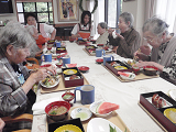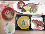 <連豆腐、鮎塩焼き、ほおづきトマト、茗荷寿司きんとん、菊花和え、白瓜の蕾干し、枝豆>